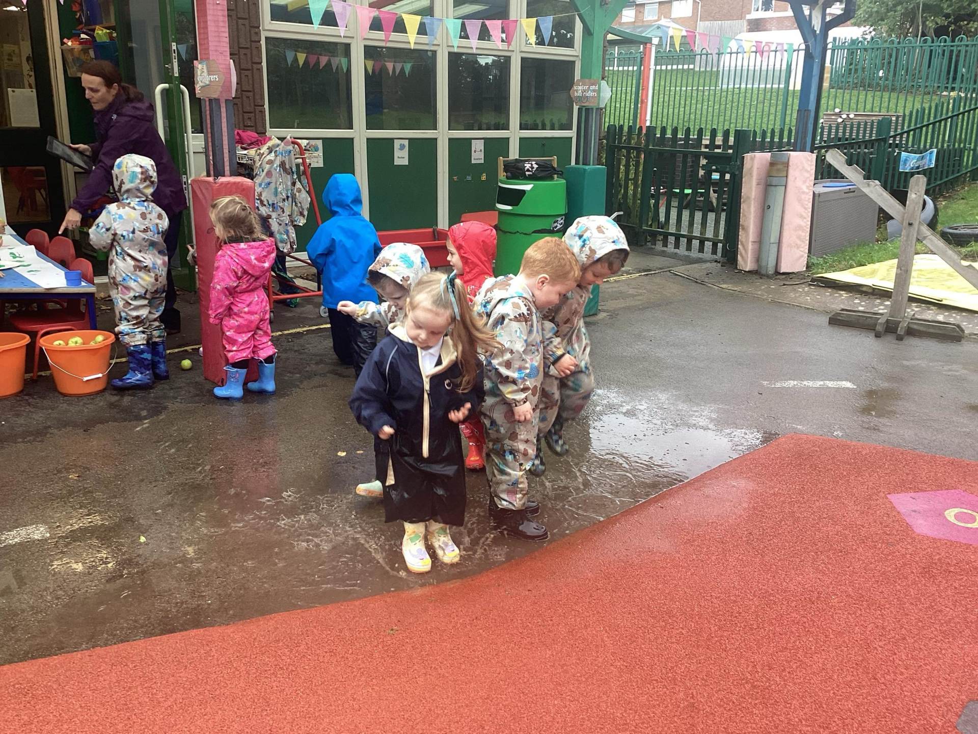Then the real adventure began! The children played lively games like Duck, Duck, Goose, giggling as they ran through the damp grass, their boots splashing with every step. The rain only added to the excitement — turning the ground into a playground of muddy puddles, perfect for jumping, splashing, and squealing with delight.